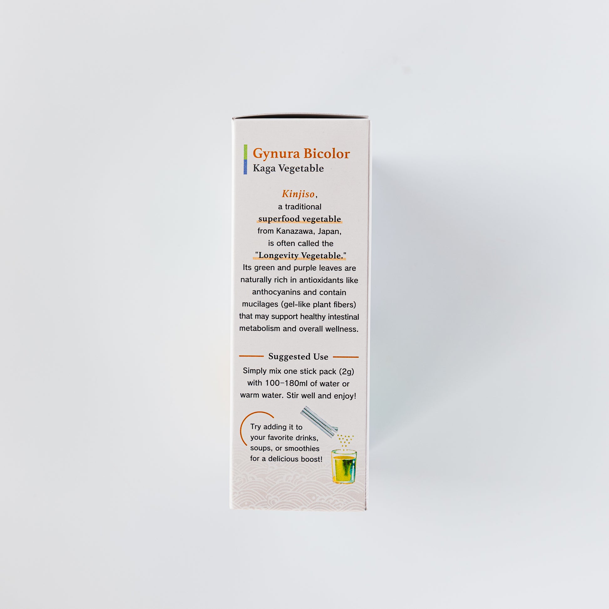 Sourced from circular agriculture farms in Ishikawa, Japan, this dietary supplement is made from 100% Kinjiso (Gynura bicolor) — a traditional Kaga vegetable known for its vivid purple leaves and natural health benefits.