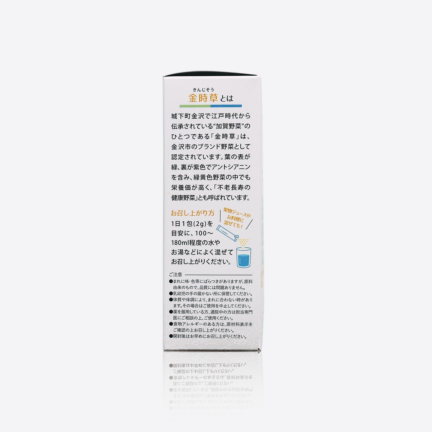Made with 100% Kinjiso (Gynura bicolor), one of Japan’s treasured Kaga vegetables, this nutritional supplement delivers the full power of nature straight to you.